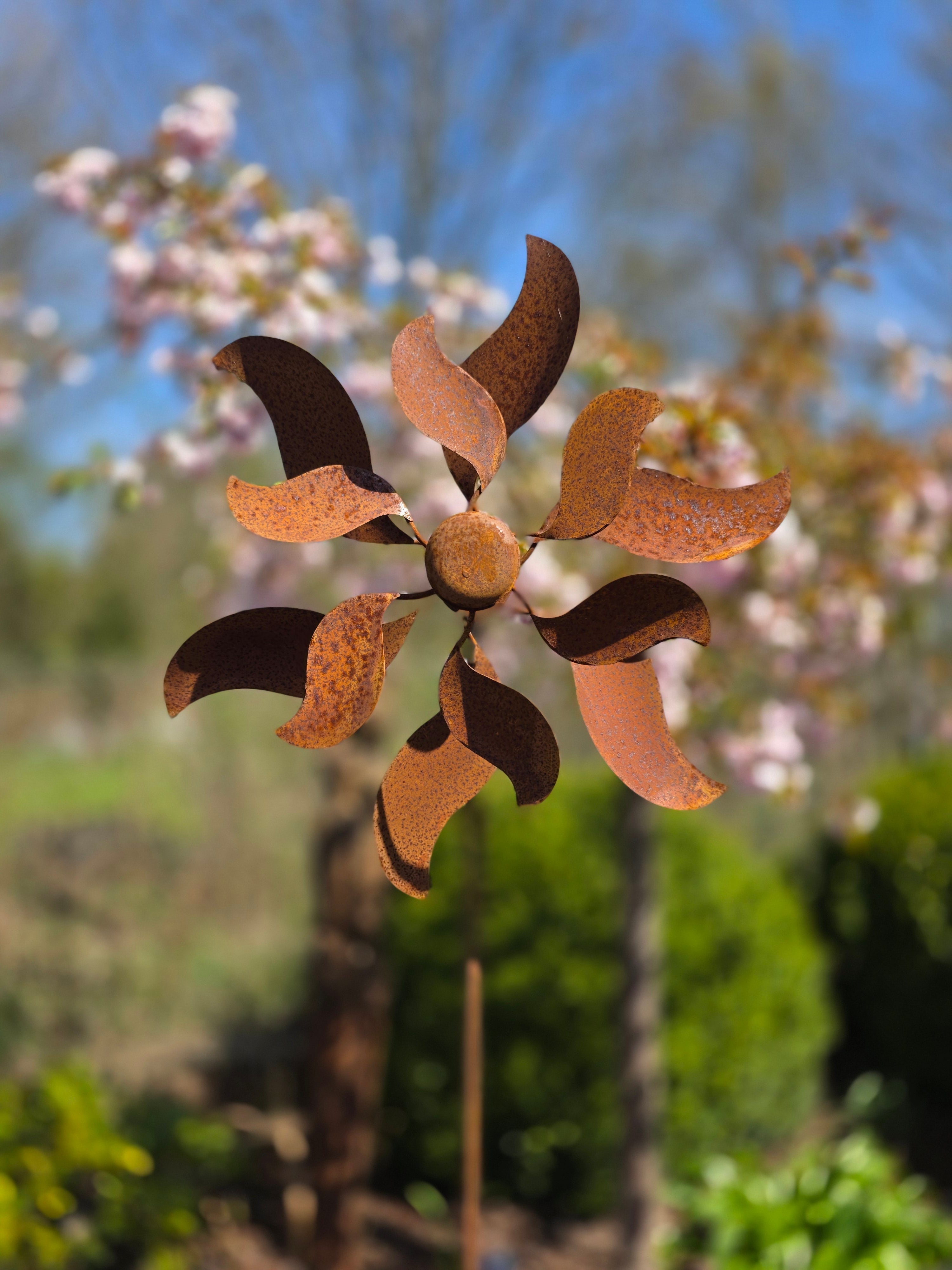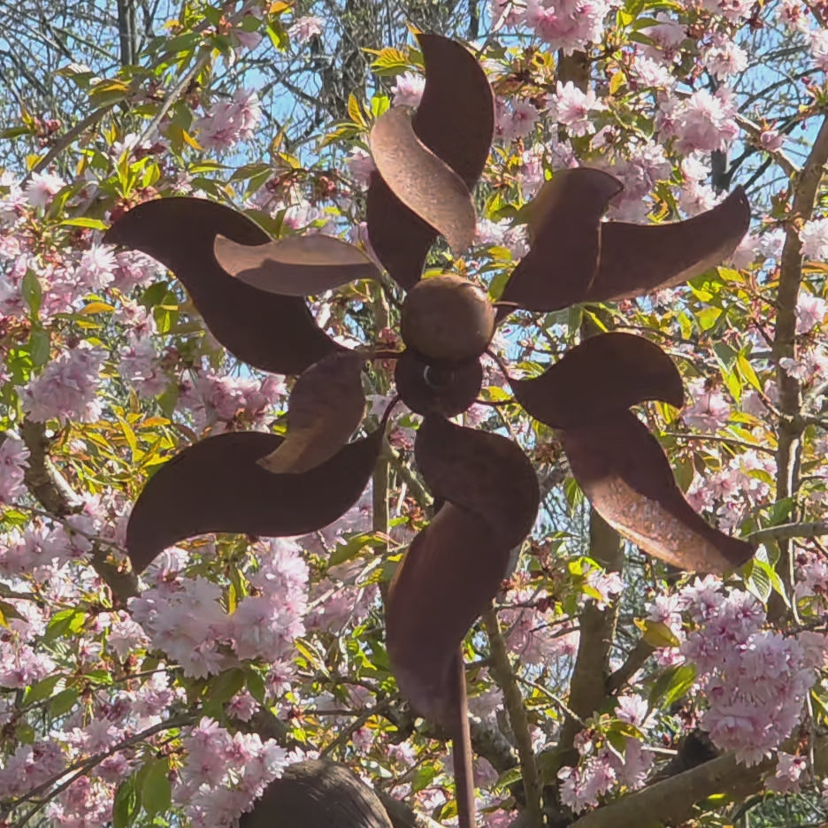 Dieses charmante Doppel-Windrad aus hochwertigem Edelrost-Stahl ist mehr als nur eine Gartendekoration. Es ist ein kleines Kunstwerk, das mit jedem Windstoß zum Leben erwacht. Die warme, rostbraune Patina verleiht ihm einen natürlichen, zeitlosen Charakter – und wird mit den Jahren noch schöner.
