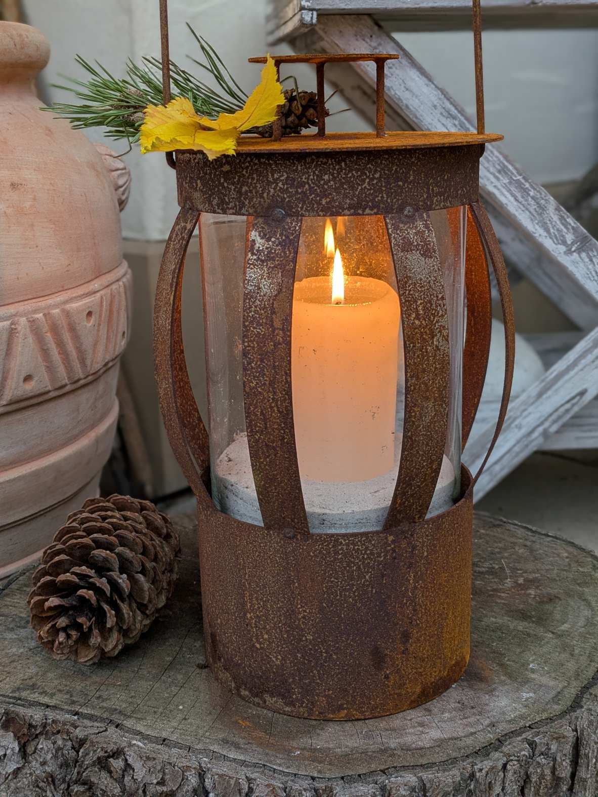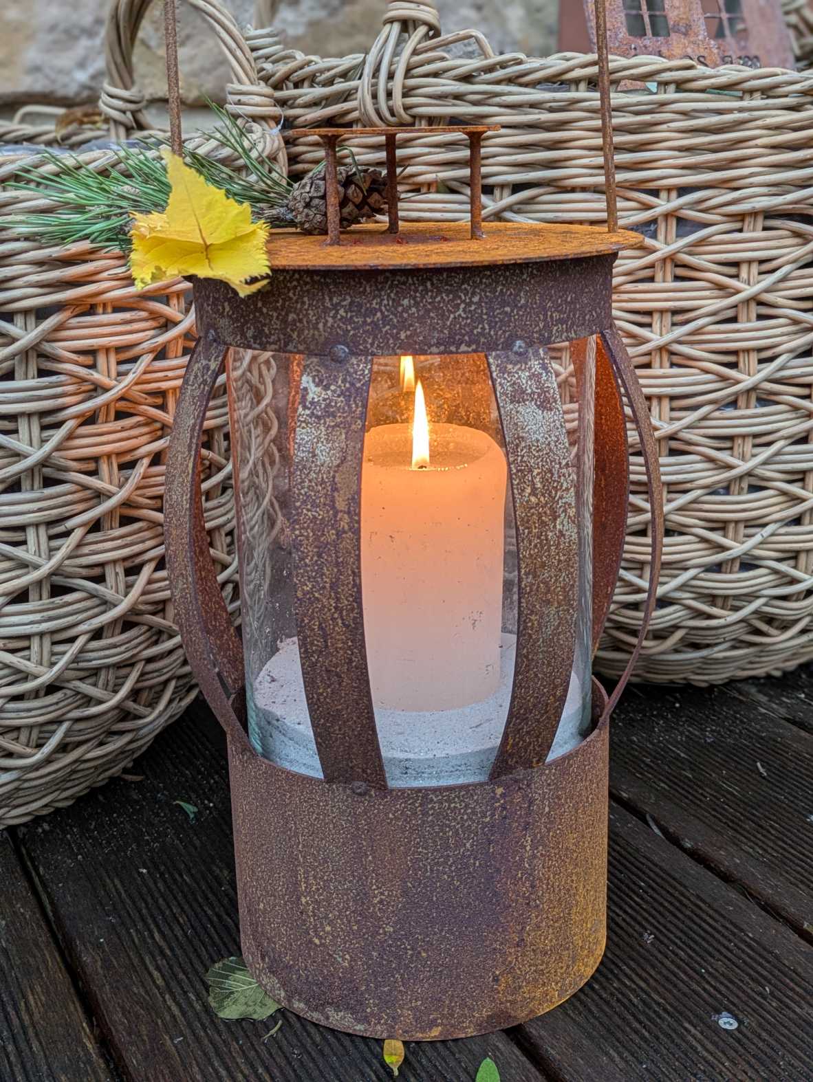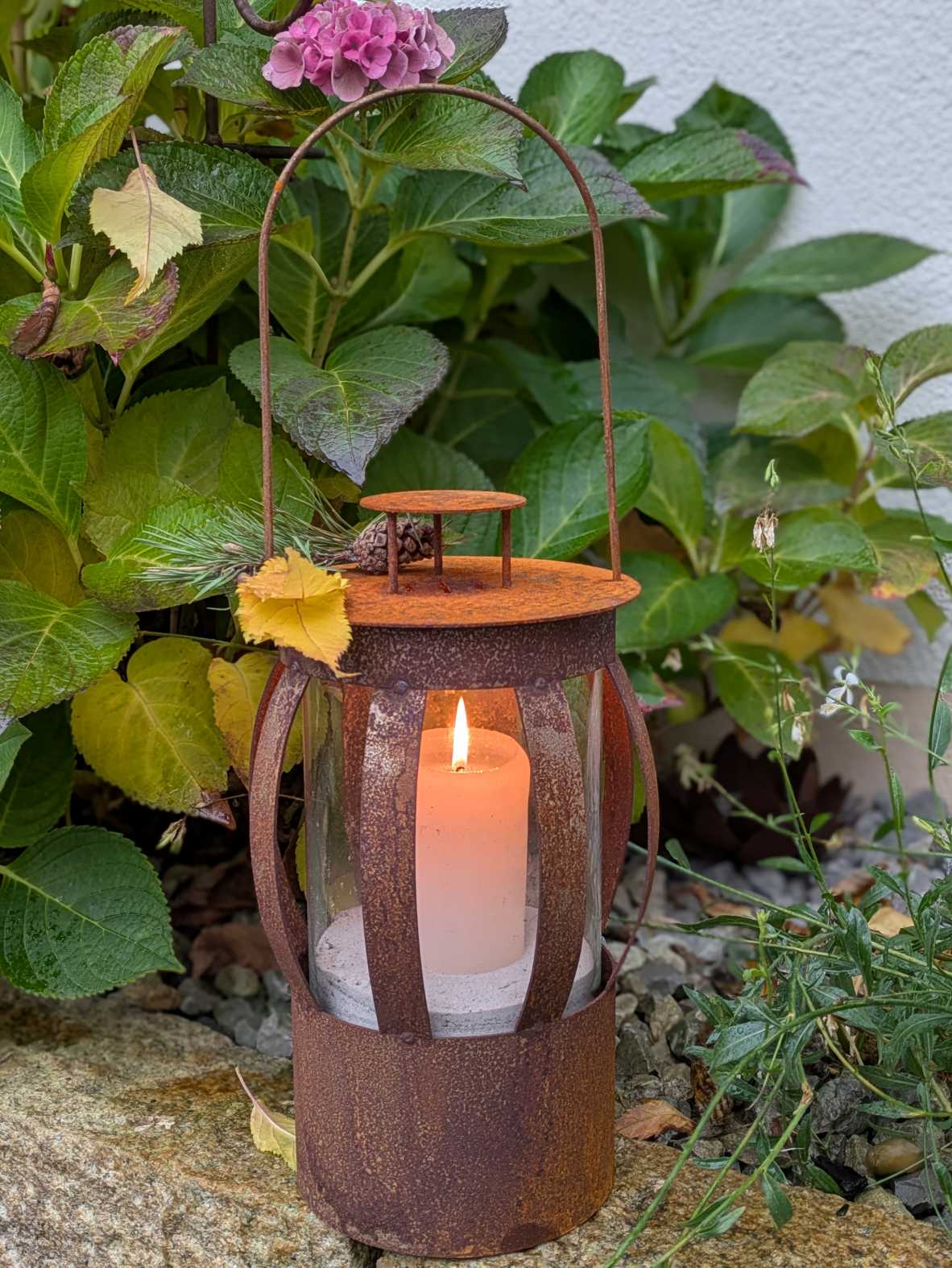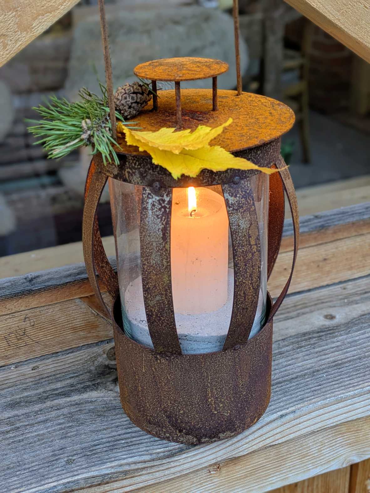 Gefertigt aus hochwertigem Stahlblech mit authentischer Rostpatina und einem klaren Glaseinsatz, sorgt sie für stimmungsvolles Licht im Garten, auf der Terrasse oder dem Balkon.