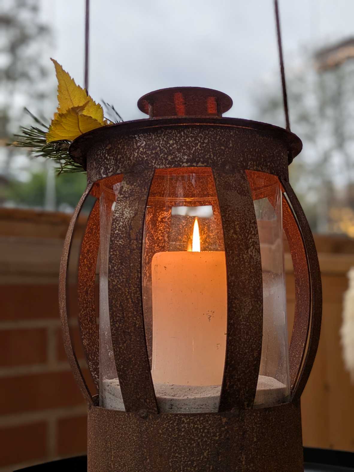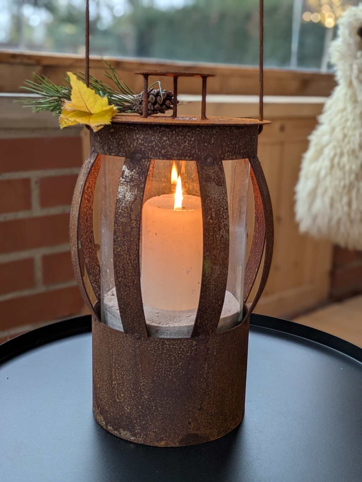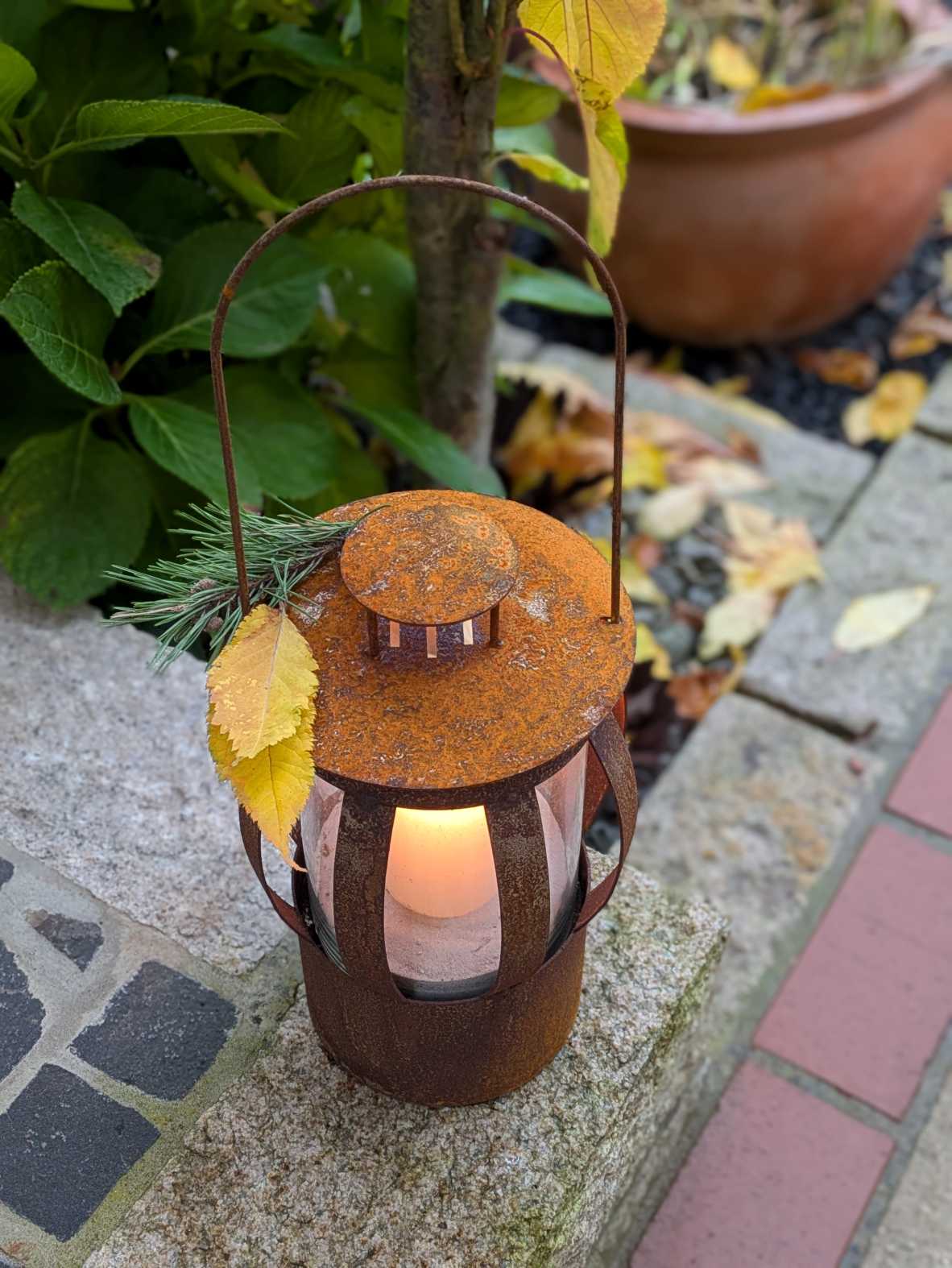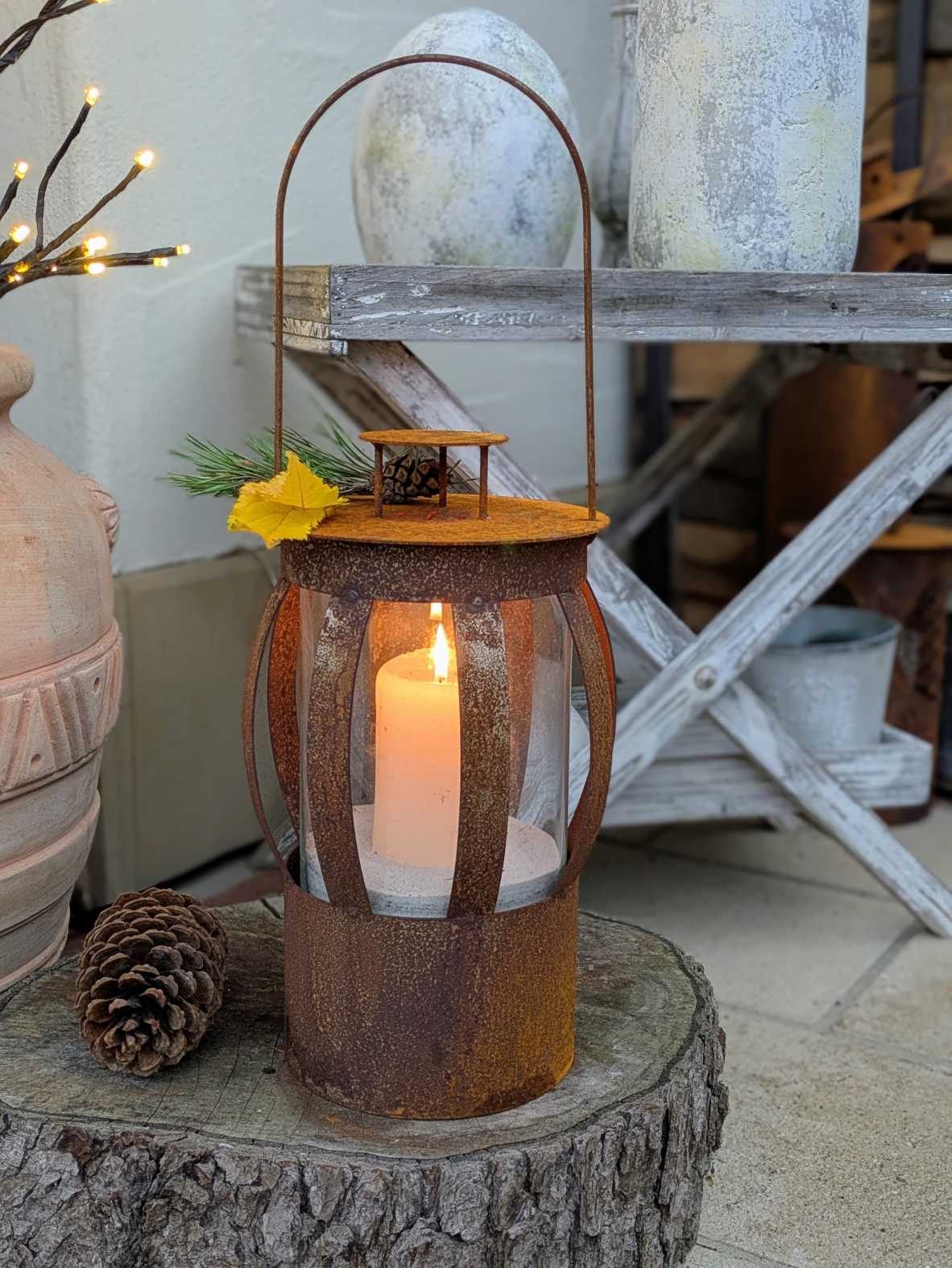 Gefertigt aus hochwertigem Stahlblech mit authentischer Rostpatina und einem klaren Glaseinsatz, sorgt sie für stimmungsvolles Licht im Garten, auf der Terrasse oder dem Balkon.